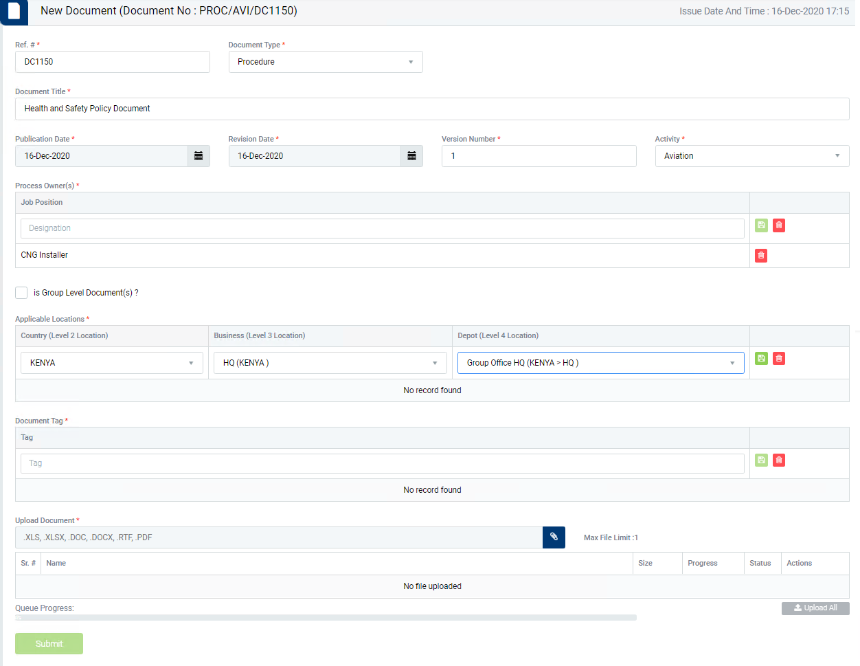 - If document is made applicable at Location = “Depot Level” then all users at Depot Level will have to acknowledge the document according to selection of Activity and Country.