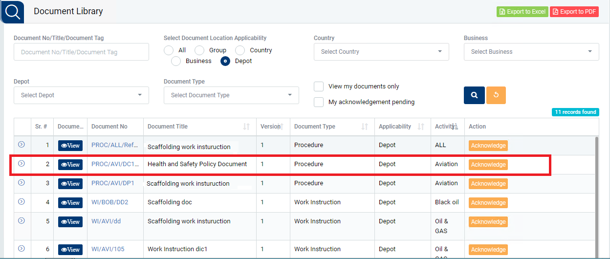 - User can filter search results by Document No/Title/Tag, Location applicability, Country, Business, Depot, Document Type.